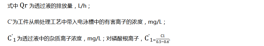 為了凈化電泳槽液,需要排放部分超濾液,以排除影響電泳槽液性能的有害雜質(zhì)離子,排放量按照下面方式參考計(jì)算: