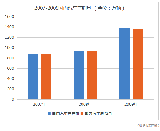 2007年,國內汽車總產(chǎn)量888.24萬輛,總銷量879.15萬輛;2008年,分別為934.5萬輛和938.05萬輛;2009年為1379.1萬輛和 1364.48萬輛。