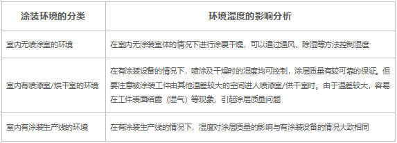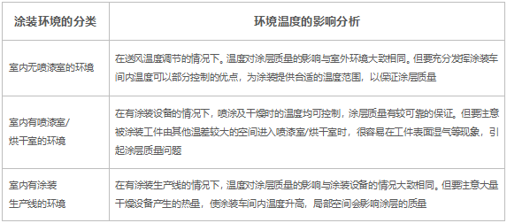 涂裝環(huán)境溫度對涂膜固化有著直接影響,并影響涂層與基材的結(jié)合力以及涂層之間的結(jié)合力。涂裝環(huán)境溫度過高,會使涂層附著力降低。環(huán)境溫度過低,溶劑不容易逸出涂膜,增大分子鏈間的自由體積,導(dǎo)致腐蝕因子滲透使抗腐蝕性能下降;反應(yīng)性涂料則反應(yīng)緩慢而不充分,不能形成優(yōu)良性能的高聚物。(環(huán)境溫度對涂層質(zhì)量的影響分析見下表。)