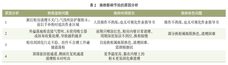 現(xiàn)狀分析:噴粉工位在測算標(biāo)準(zhǔn)作業(yè)時(shí)間時(shí),主要在換粉時(shí)超出作業(yè)時(shí)間,因噴粉工位為大小兩個(gè)噴粉室,在顏色更換時(shí)需要對集中供粉及噴粉室內(nèi)部進(jìn)行清理,同時(shí)噴粉室周邊有少量溢粉,定期清理耽誤節(jié)拍時(shí)間,具體原因分析見表2。