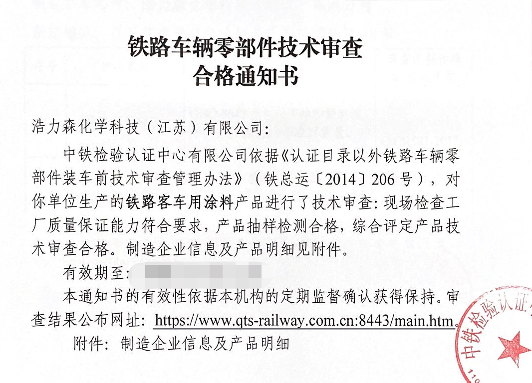 浩力森成功進(jìn)軍軌交行業(yè),第一次獲得CRCC(中國(guó)鐵路總公司認(rèn)證)認(rèn)證,此次認(rèn)證覆蓋整車外部涂料所有涂層,標(biāo)志著浩力森正式進(jìn)入中車系統(tǒng),有資格成為其合作伙伴。不僅如此,浩力森還喜獲主機(jī)廠準(zhǔn)入資格。