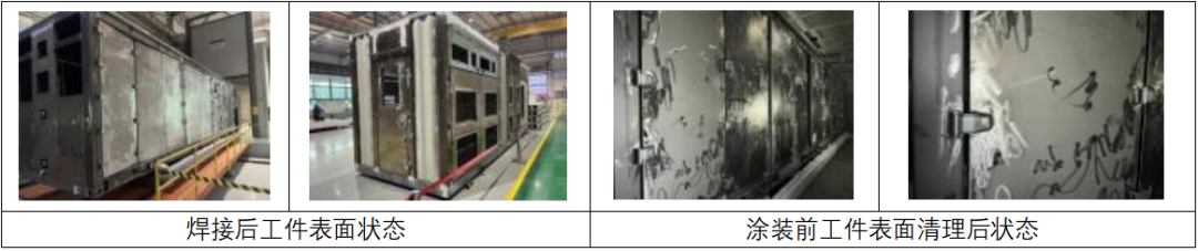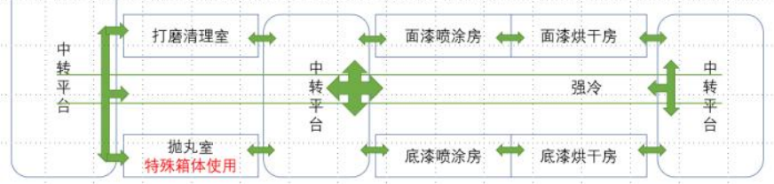 1.  碳鋼厚板件:自動(dòng)拋丸→清理→富鋅漆自動(dòng)噴涂(8-15μm 做短期防銹)→烘烤(設(shè)定 80℃) →冷卻→下件; (與集裝箱前處理工藝及性質(zhì)相同)